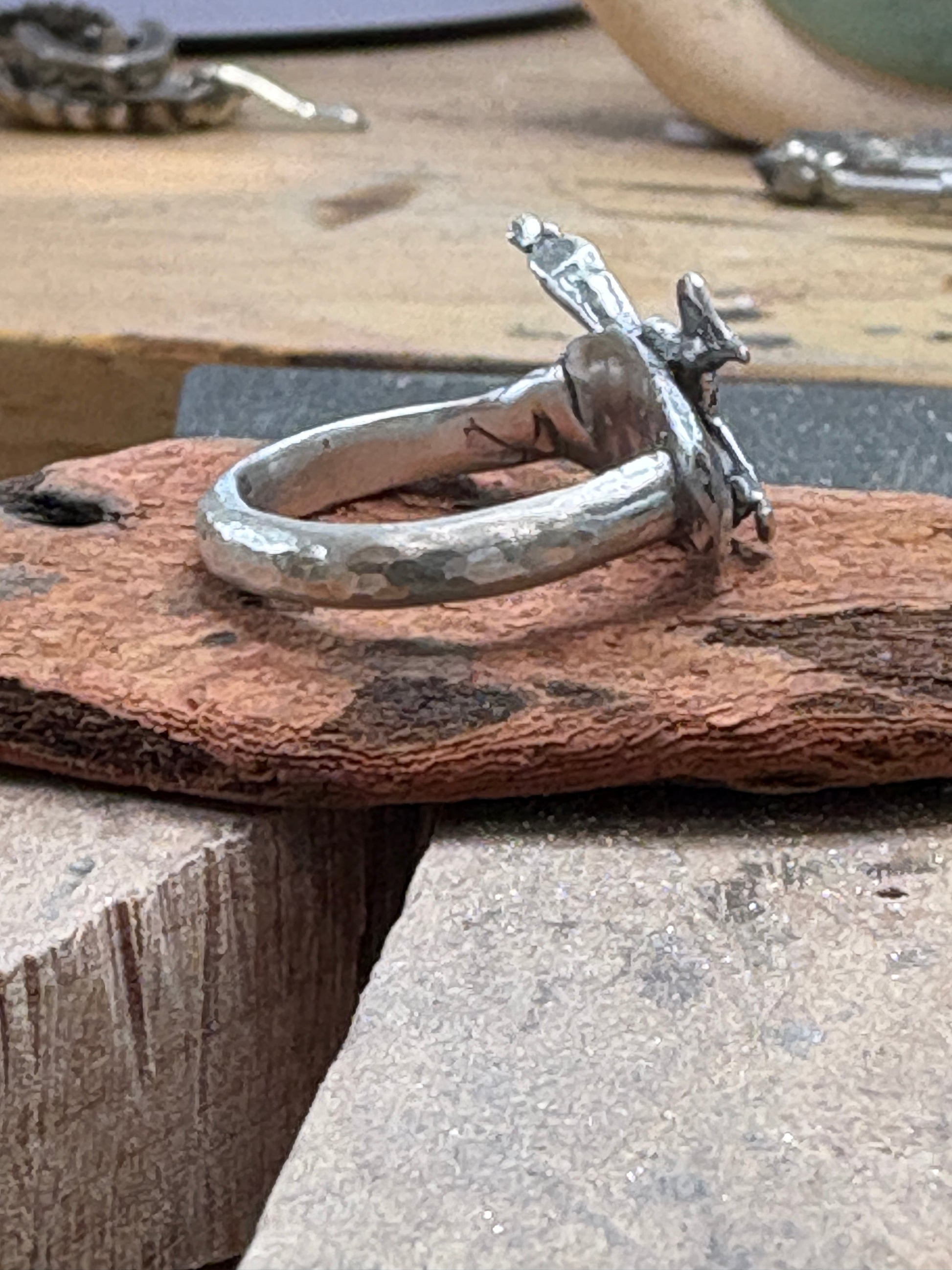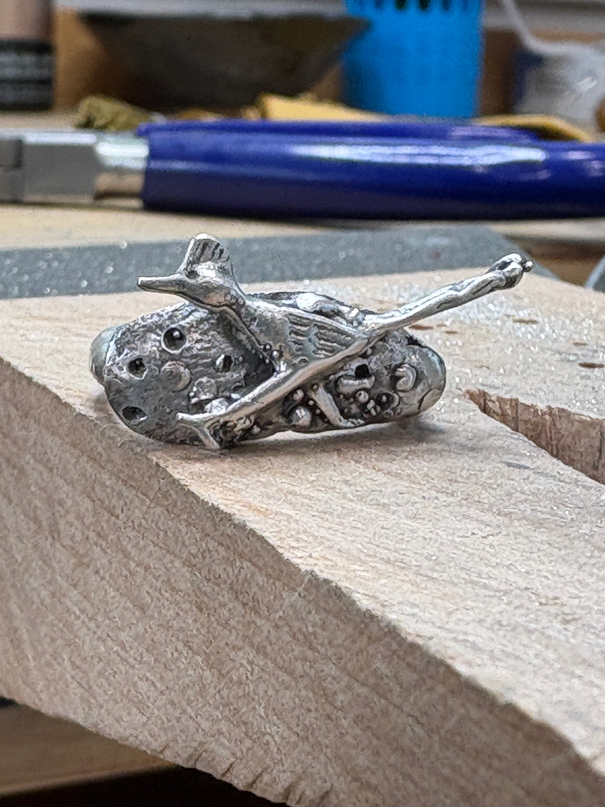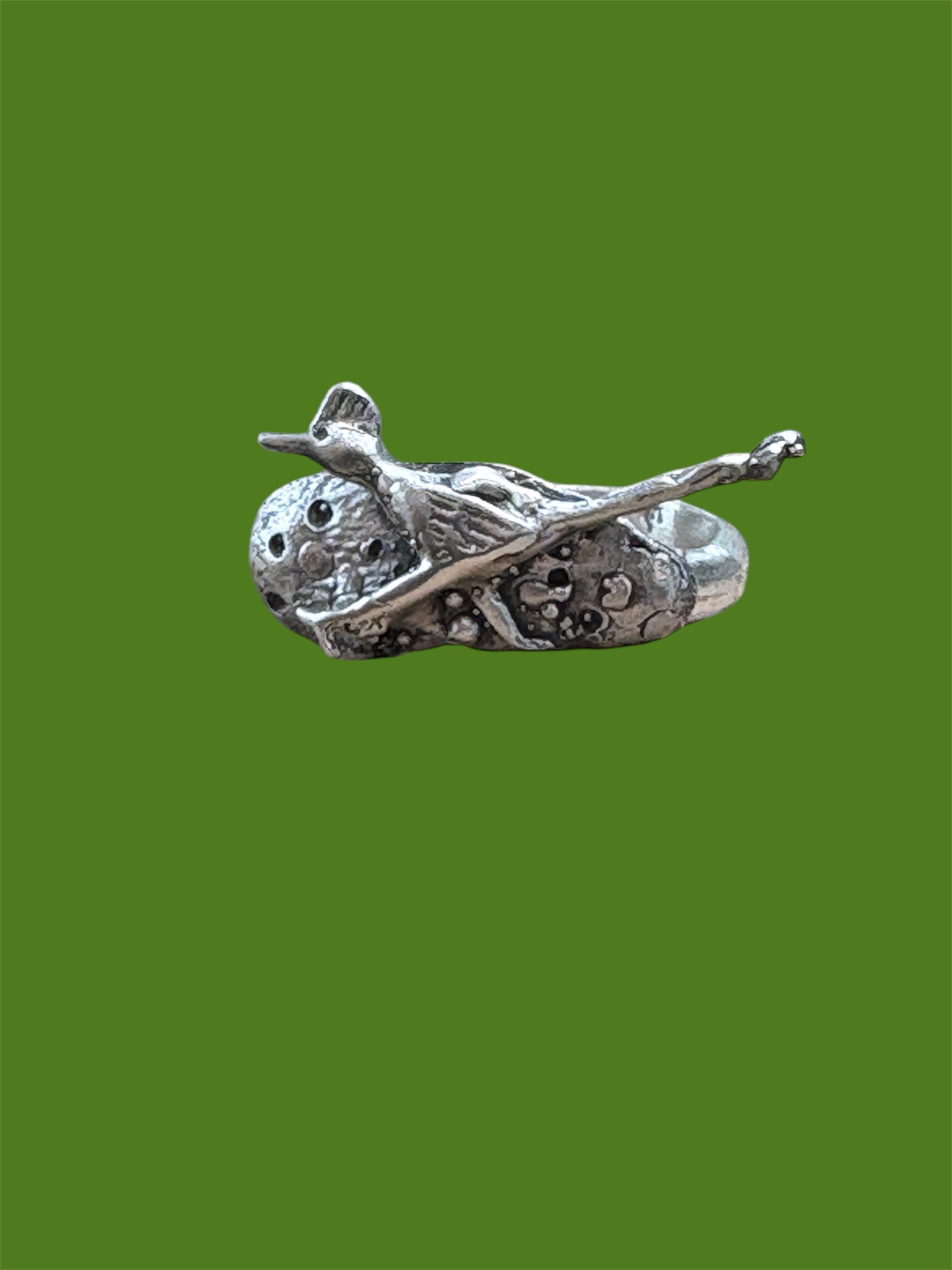 This is a sterling silver, wax casted, ring. Size 5.5. The band is lightly textured and is very comfortable. If you're a roadrunner fan like I am, this is the statement ring for you. The tail is long, because roadrunner tails are long, so this is a great ring to wear out, show it off, but not your all day, work-in-the-garden, ski glove, kind of ring!!