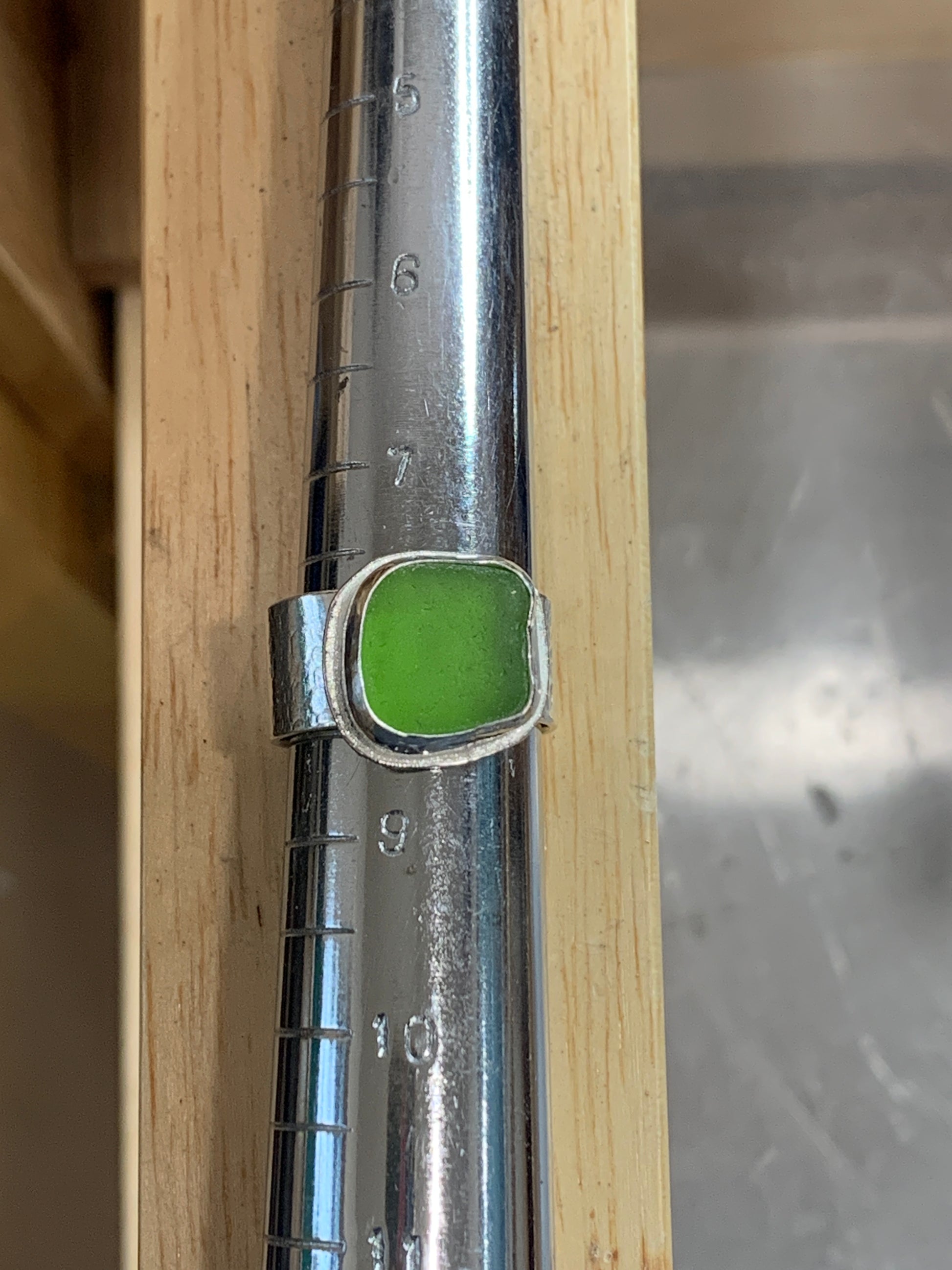 Sterling silver, wide textured band with a chunk of green sea glass. Size 8, keep in mind this is a wide band.
